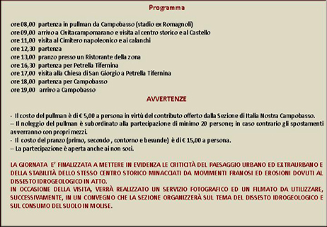 La nostra Sezione prenoterà un pullman, che da Campobasso ci porterà a Civitacampomarano, contribuendo con metà della spesa. E’ previsto il pranzo presso un ristorante della zona al costo di circa 15/16 euro a persona. Nel pomeriggio, tornando a Campobasso, si potrà visitare la famosa Chiesa di S. Giorgio a Petrella Tifernina.