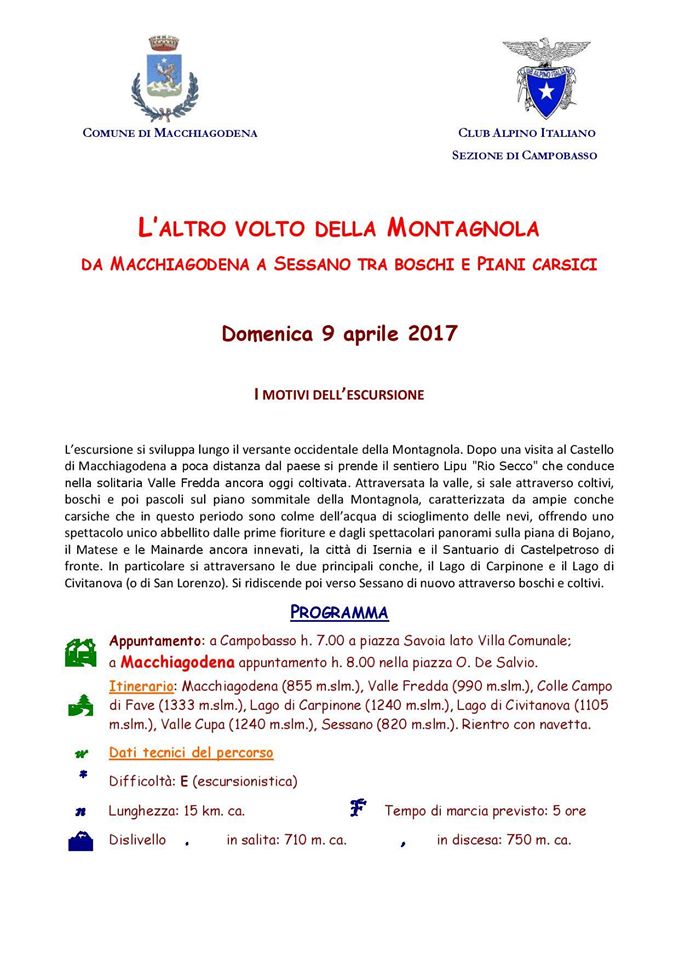 L’escursione, organizzata in collaborazione con il CLUB ALPINI ITALIANI – Sezione di Campobasso – si sviluppa lungo il versante occidentale della Montagnola. Dopo una visita al Castello di Macchiagodena si prende il sentiero Lipu “Rio Secco” che conduce a Valle Fredda. Attraversata la valle, si sale attraverso coltivi, boschi e poi pascoli sul piano sommitale della Montagnola, caratterizzata da ampie conche carsiche che in questo periodo sono colme dell’acqua di scioglimento delle nevi, offrendo uno spettacolo unico abbellito dalle prime fioriture e dagli spettacolari panorami sulla piana di Bojano, il Matese e le Mainarde ancora innevati, la città di Isernia e il Santuario di Castelpetroso di fronte. In particolare si attraversano le due principali conche, il Lago di Carpinone e il Lago di Civitanova (o di San Lorenzo). Si ridiscende poi verso Sessano di nuovo attraverso boschi e coltivi. Nella locandina allegata si può prendere visione del programma, dell’itinerario completo, dei dati tecnici del percorso e di tutta l’organizzazione.