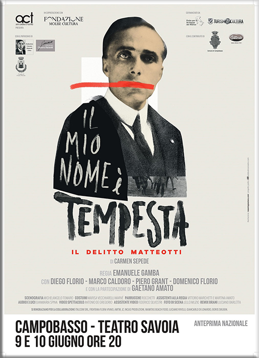 Riaprono i teatri e riparte la cultura. Il Teatro Savoia di Campobasso riapre agli spettacoli dal vivo, dopo i tanti mesi di chiusura per l’emergenza Covid, con una grande anteprima nazionale che parte dal Molise. Nei giorni 9 e 10 giugno, alle ore 20, l’atteso debutto, a lungo rinviato a causa della pandemia, dello spettacolo ‘Il mio nome è Tempesta. Il delitto Matteotti’. Prodotto dall’associazione culturale A.C.T., in coproduzione con la Fondazione Molise Cultura, il progetto ha ricevuto il sostegno e il finanziamento della Regione Molise, nell’ambito del bando Turismo è Cultura – Patto per lo sviluppo del Molise e il contributo del Comune di Campobasso, partner istituzionale del bando, insieme al Comune di Fratta Polesine, in Veneto, paese natio di Giacomo Matteotti. Al fianco di A.C.T. la Fondazione Giacomo Matteotti Onlus, presieduta da Alberto Aghemo, che ha concesso il patrocinio e la consulenza storico-scientifica, oltre alla Casa Museo Giacomo Matteotti. Non casuale la scelta delle date del debutto di ‘Il mio nome è Tempesta. Il delitto Matteotti’, in contemporanea con le celebrazioni nazionali per la morte del deputato e segretario del Partito Socialista Unitario. Il 10 giugno 1924 Giacomo Matteotti, ‘Tempesta’, come lo chiamavano i suoi compagni di partito, fu rapito e ucciso da un gruppo di squadristi fascisti guidato da Amerigo Dumini.
