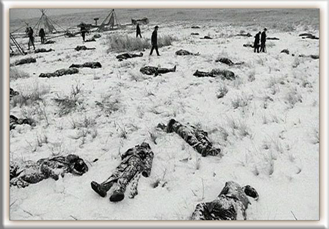 Quella dichiarazione di guerra del 1 febbraio fu l’inizio del massacro degli Indiani d’America, che culminerà con l’eccidio di Wounded Knee, passato alla storia grazie a canzoni, libri e film. Sul finire del dicembre 1890, la tribù di Miniconjou guidata da Piede Grosso, appresa la notizia dell’assassinio di Toro Seduto, partì dall’accampamento sul torrente Cherry, sperando nella protezione di Nuvola Rossa. Il 28 dicembre furono intercettati dal Settimo Reggimento, che aveva l’ordine di condurli in un accampamento sul Wounded Knee: 120 uomini e 230 tra donne e bambini furono portati sulla riva del torrente, circondati da due squadroni di cavalleria e trucidati.